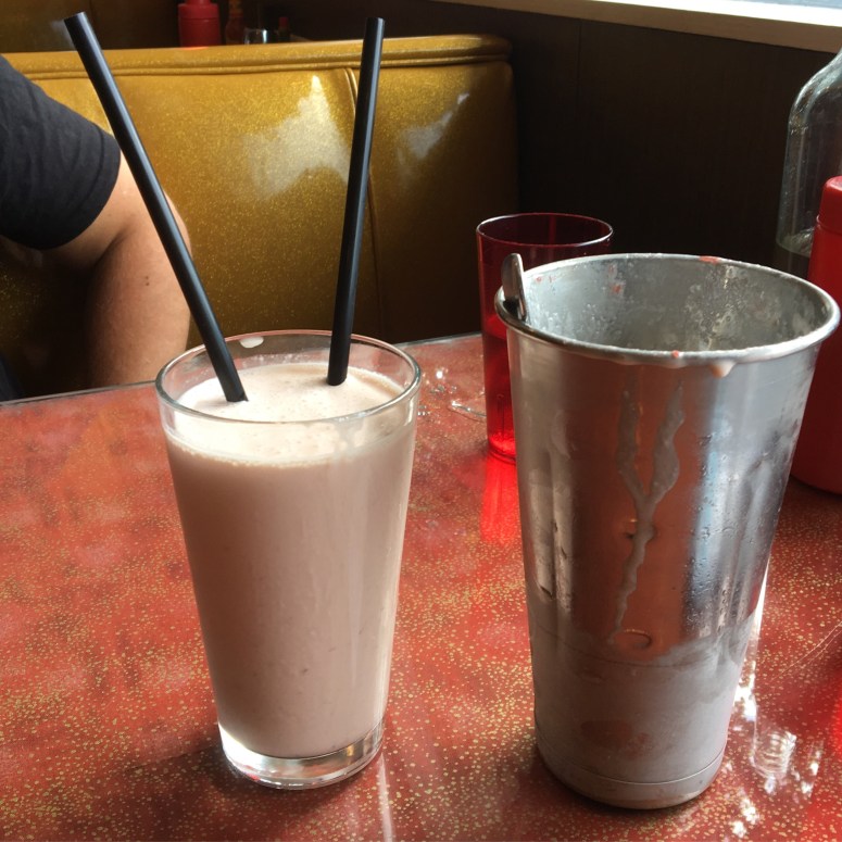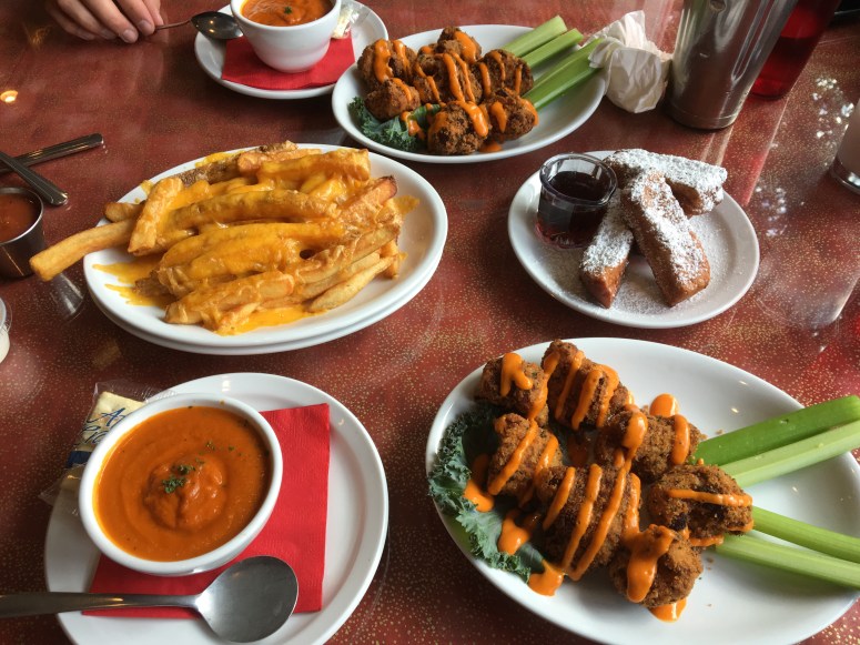 Sundays are always a little hard for me, but eating and good company can cheer me up! One of my best friends Kryspin and I decided to treat ourselves with some delicious treats. North Star Diner is such an interesting and cozy place. It is connected to a bar called The Shanghai Room. The location used to be a Chinese restaurant called Yen Wor Garden. When North Star took over in 2013 they kept the same theme but added their funky spin to the decor and menu. I would describe it as a Chinese spaceship diner. The wall is filled with old pictures of astronauts, the seats are sparkly gold that scream 50’s diner, and it’s open 24/7. They serve what seems to me as American comfort food. I really enjoyed the atmosphere including the friendly server and great music. Everything was fairly priced and we went at happy hour so all of our “snacks” were $2 off. (Not including tomato soup or shake)