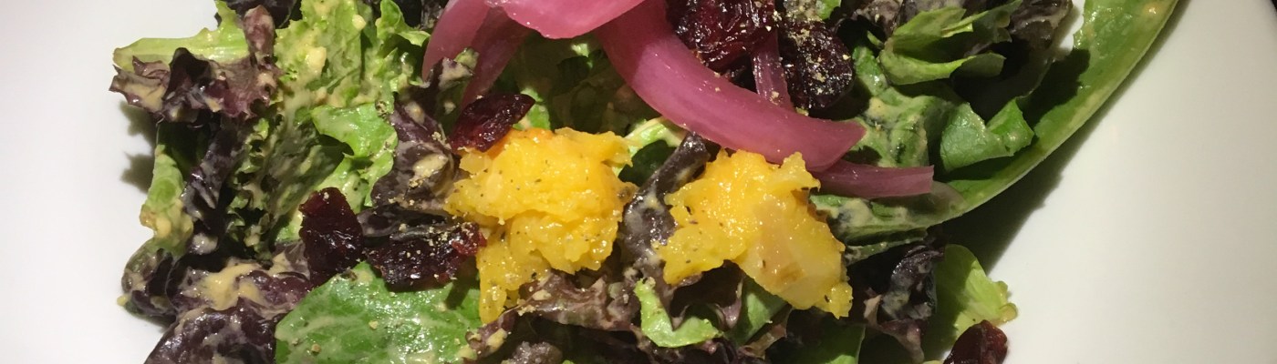 Mixed Green Autumn Salad: Served with Pumpkin dressing, squash, cranberries, and pickled red onions. This was the perfect fall salad, everything worked well together and gave me yet another way to use pumpkin. YUM!